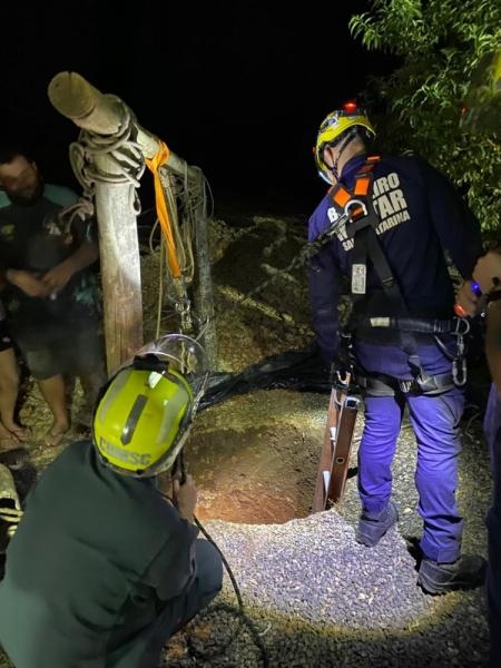 O animal, de porte médio, foi localizado em um poço situado ao lado de uma lavoura. A situação era delicada: o buraco possuía uma profundidade estimada de 8 metros, com uma lâmina d’água de aproximadamente 40 centímetros no fundo.