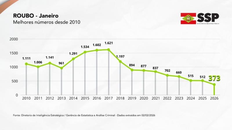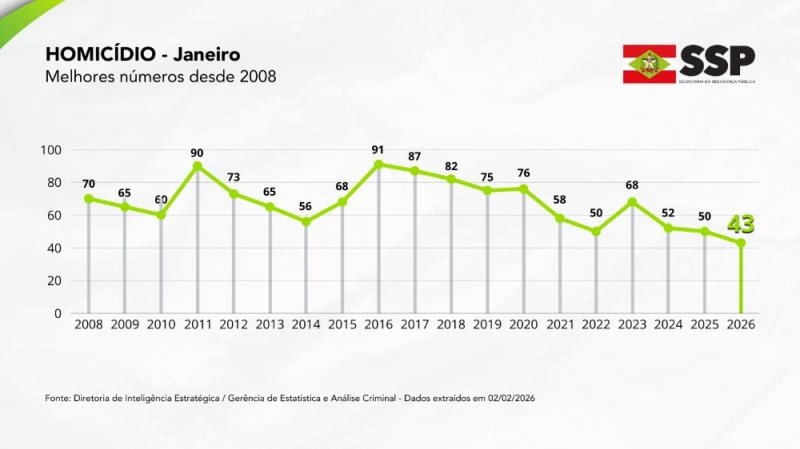 Santa Catarina abriu 2026 com indicadores históricos de segurança pública. Segundo dados da Secretaria de Estado da Segurança Pública (SSP-SC), o mês de janeiro apresentou a maior redução de homicídios das últimas duas décadas, além de quedas drásticas em roubos e furtos.