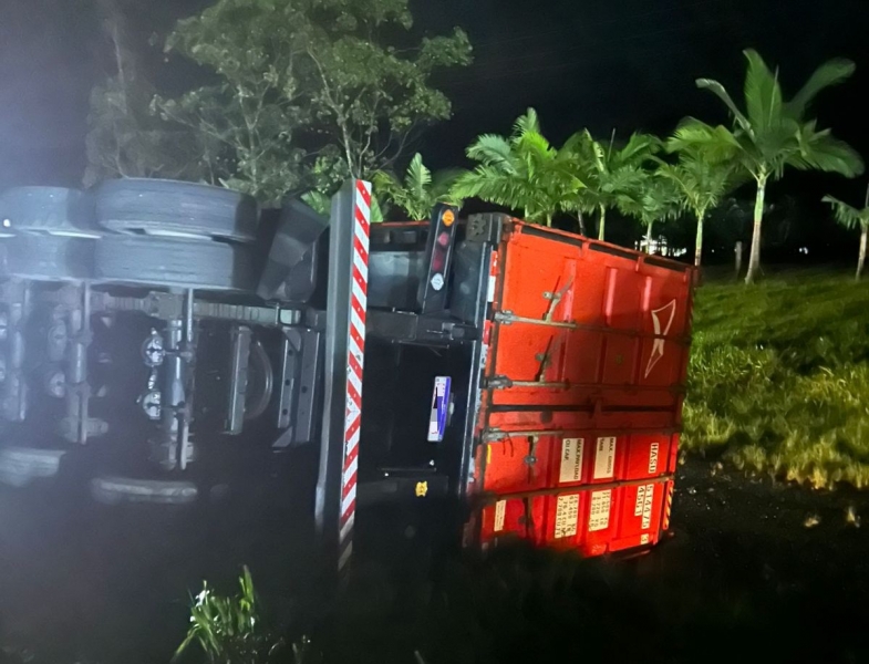 Na noite deste domingo (22), um acidente de trânsito foi registrado na BR-101, em Garuva, envolvendo a saída de pista seguida de tombamento de um caminhão que transportava um contêiner. O chamado ocorreu por volta das 23h40, após um popular comparecer pessoalmente ao quartel do Corpo de Bombeiros para solicitar socorro.