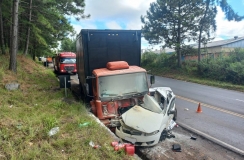 Fumaça na pista comprometeu a visibilidade e causou colisão contra viatura que sinalizava a rodovia; motorista ficou ferido.