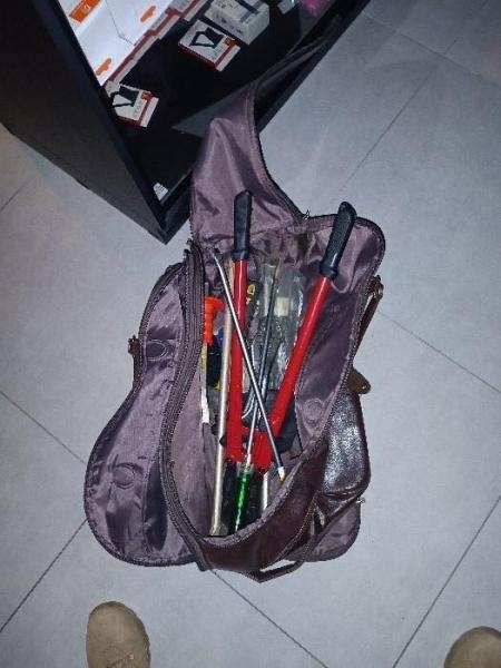 No interior da loja, os policiais encontraram sacos já abastecidos com produtos eletrônicos prontos para o transporte. Além da mercadoria recuperada, foi apreendida uma bolsa de couro contendo o "kit de arrombamento" utilizado pela dupla, composto por: