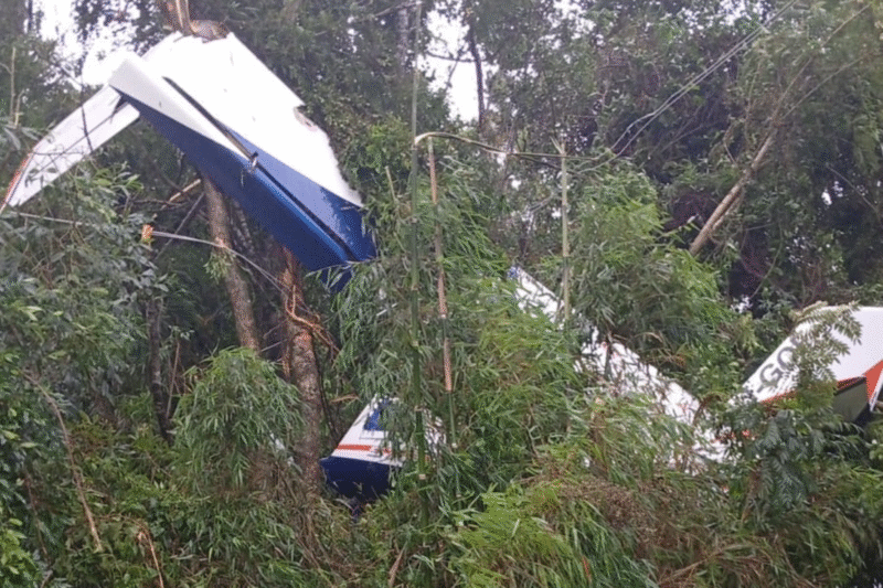 Cena do acidente: O monomotor ficou preso entre árvores, dificultando o acesso inicial.