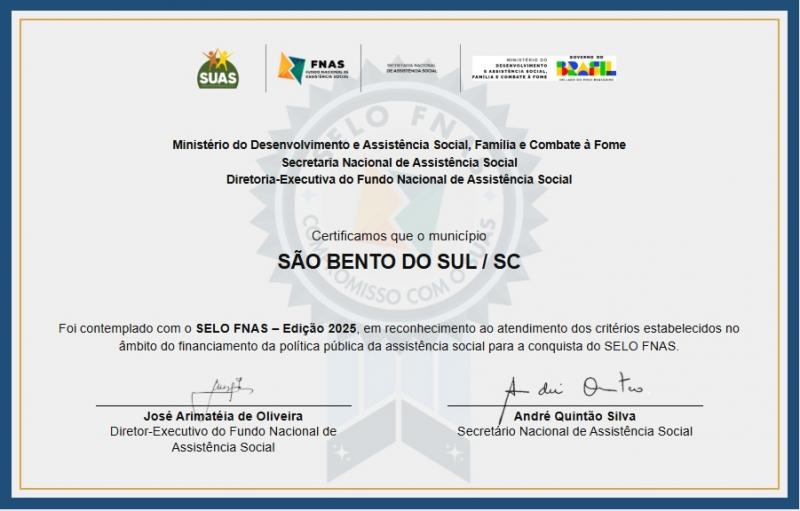 São Bento do Sul alcançou um novo patamar na gestão pública ao receber o Selo FNAS, certificação de prestígio concedida pelo Fundo Nacional de Assistência Social. O reconhecimento coloca o município em destaque em todo o Brasil pela excelência na execução das políticas do Sistema Único de Assistência Social (SUAS).