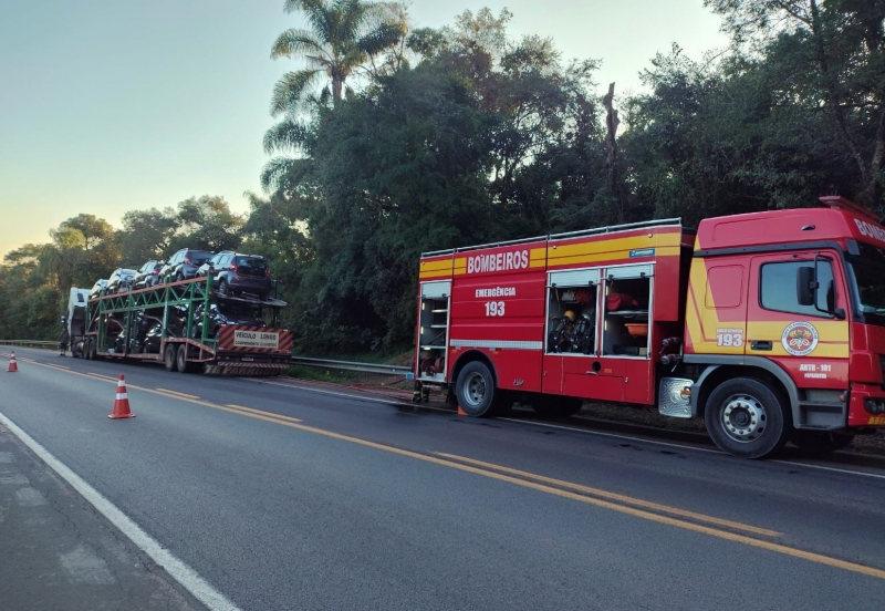 Ao chegarem no local, os socorristas da viatura ABTR-101 confirmaram a ocorrência envolvendo uma carreta do tipo cegonha, acoplada a um cavalo mecânico DAF XF. O veículo estava carregado com 11 automóveis 0km.